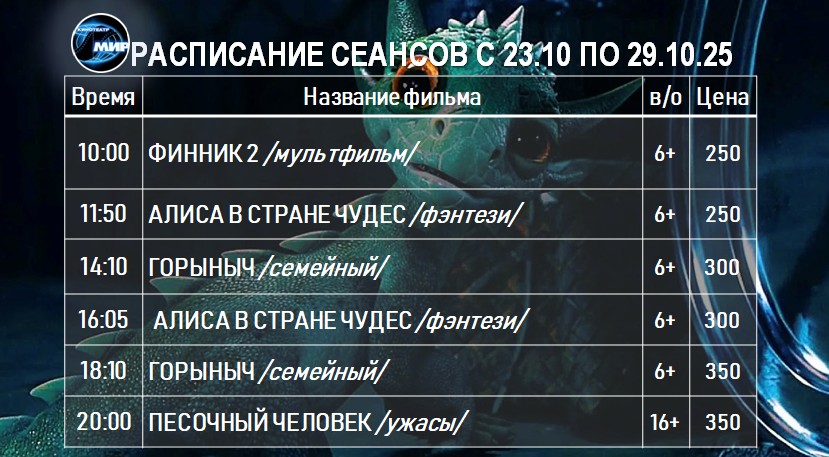 Администрация кинотеатра оставляет за собой право изменять репертуар по техническим причинам!